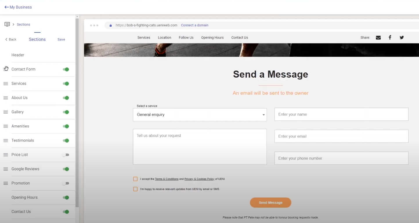 La plate-forme d’Ueni comprend des fonctionnalités de commerce électronique essentielles qui vous permettent de vendre des produits en ligne avec des listes de produits illimitées et plusieurs méthodes de paiement (cartes de crédit, PayPal, paiements hors ligne) sans frais de commission. Le service comprend également un système de réservation de rendez-vous qui fonctionne à partir du premier jour, avec des confirmations par e-mail et des capacités de synchronisation du calendrier. Bien que l’éditeur d’Ueni ne soit pas le plus avancé, il propose des contrôles intuitifs pour apporter des modifications après la construction de votre site, ainsi que des widgets et des intégrations telles que des galeries de photos avancées, des enquêtes clients, des analyses Google et des flux de médias sociaux.